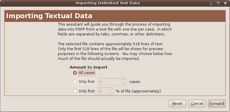 Import wizard for delimited data files is available through File – Import delimited text data and works for textual data only. First, we have to select a file and decide what amount of data we want to import (all cases, only n first cases or only some percentage of datafile).